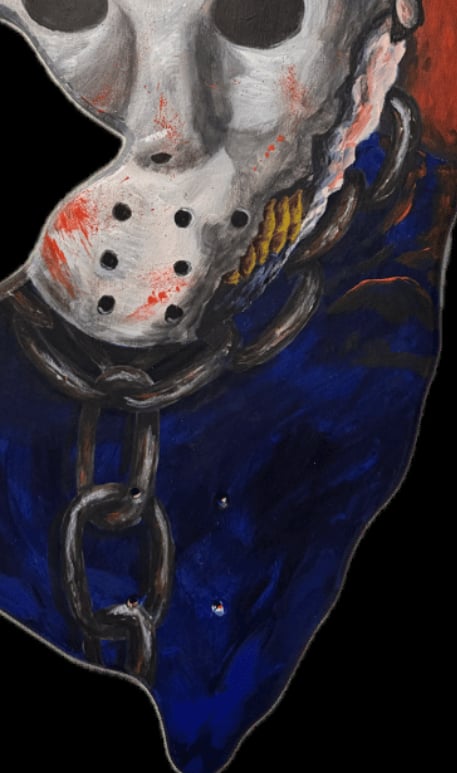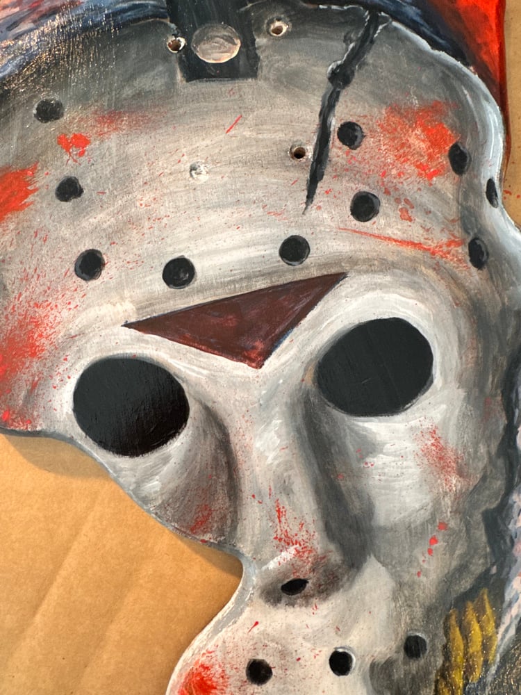 This custom Jason piece comes from my line of functional art. While the intention is to display it, it also doubles as a completely rideable NJ shaped skateboard with pre-drilled holes for trucks. Wall hanging material included. Every original piece of art comes with a gift set including a tee so let me know the size when purchasing. Shipping and handling will be calculated based on destination.